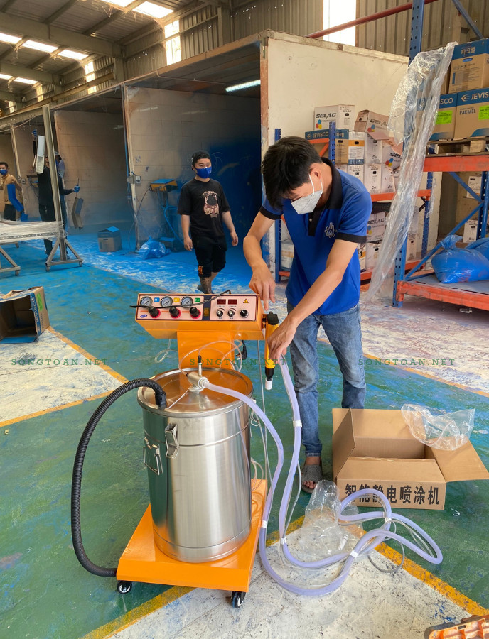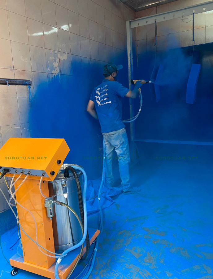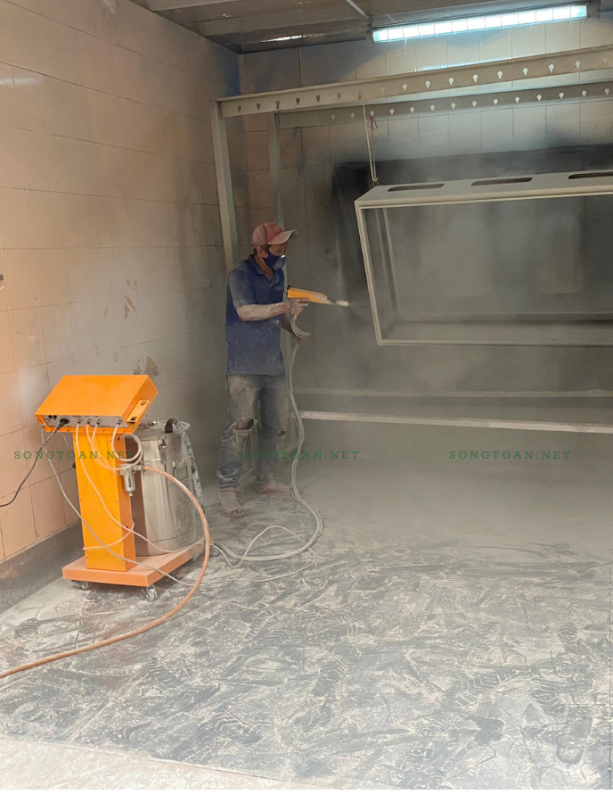 • Phun bột: sử dụng máy phun bột sơn chuyên dụng phun đều lên bề mặt sản phẩm